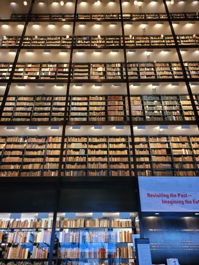 Walking through the drizzle, we made it to Beinecke, a building that sticks out from the more traditional architecture around it. Built in 1963, the library resembles something like an egg carton, its four walls made up of repeating oblong indentations. The second floor is dedicated to a rotating exhibition space, where we viewed not only a Gutenberg bible, but also The Canterbury Tales and Georgia O’Keefe’s recipe book, among many other fascinating items. Perhaps the most impressive feature of the building is the 180,000 items of the collection, visible on each of the six floors behind glass walls.