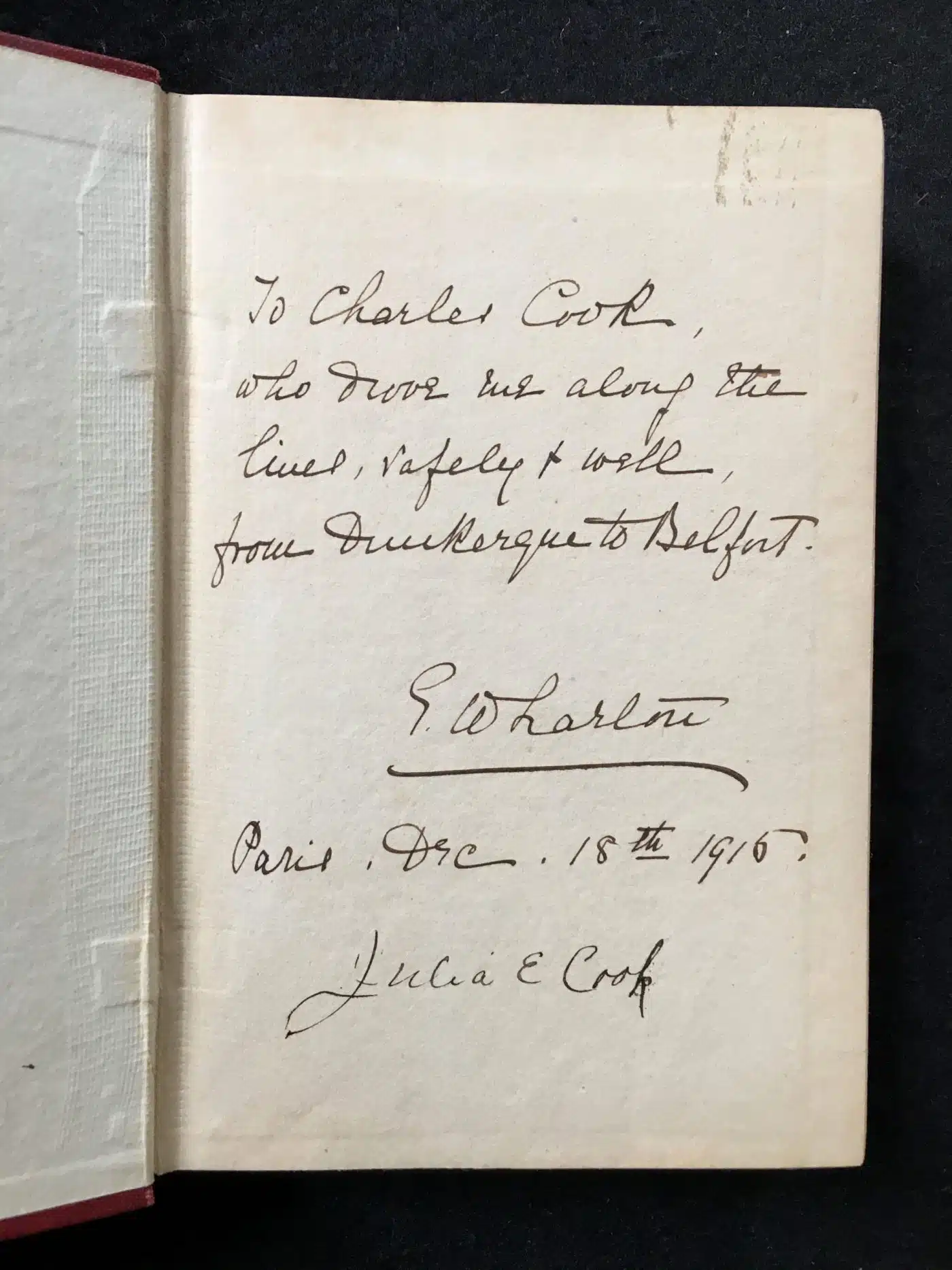 In July of 2020, thanks to generous contributions from members of The Mount’s Library Committee, we acquired an extraordinary book from D&D Galleries in New Jersey: a copy of Edith Wharton’s Fighting France: From Dunkerque to Belfort (1915), inscribed by Wharton to her chauffeur, Charles Cook. One of several books Wharton wrote about World War I, this book recounts her journeys into the devastated war zones of France, accompanied by her friend Walter Berry, with the remarkably patient and resourceful Charles Cook at the wheel.