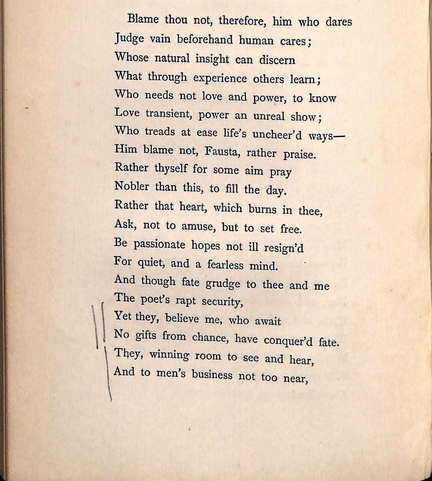 She kept the Arnold and continued to read it. Two lines from his poem “Resignation” are heavily marked and she quoted them in a letter to her lover Morton Fullerton in 1908: “You chained at one end of the world, & I at the other….My strength used to be that I could say, like the Monsieur in the Arnold poem: ‘They, believe me, who await no gifts from chance, have conquered fate–.'” Wharton, passionately in love, apparently felt she had not conquered fate.