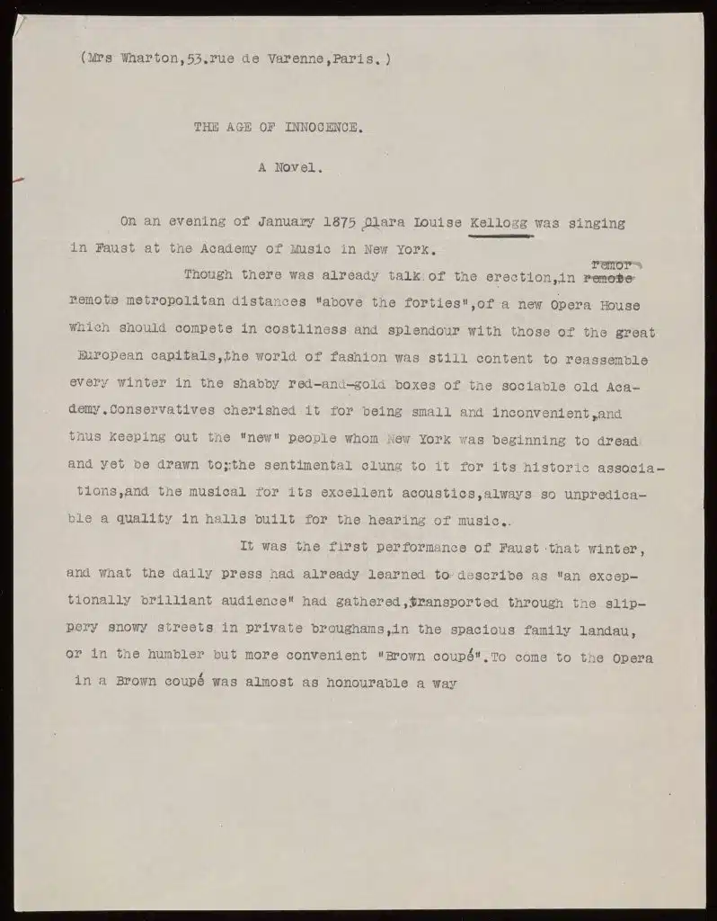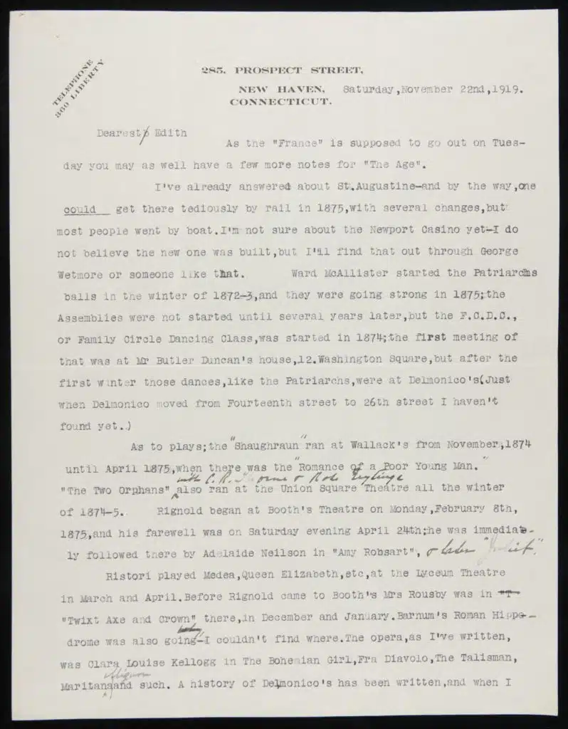 Wharton sent the manuscript to a typing service in Paris, then by ship to New York. Her publisher returned the galley proofs to Wharton, who made corrections and sent them back across the Atlantic. Her edits, even when minor, show her deftness as a writer, as she followed a process she described as “elimination, selection, concentration of idea & expression.”