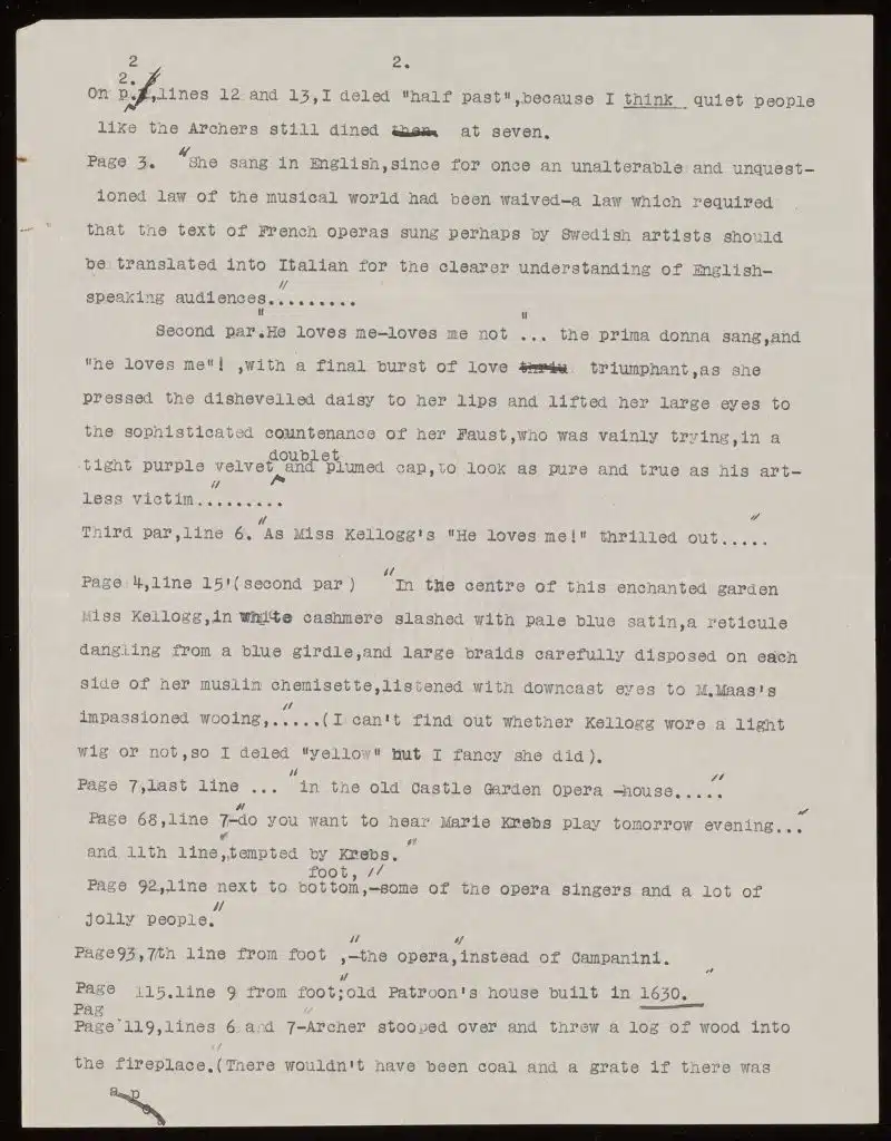 Her choice, American Clara Louise Kellogg, usually sang in English, which required multiple adjustments to Wharton’s existing text. Wharton created a long list of corrections for her editor, starting with a rewrite of the first page with Kellogg as the star soprano.