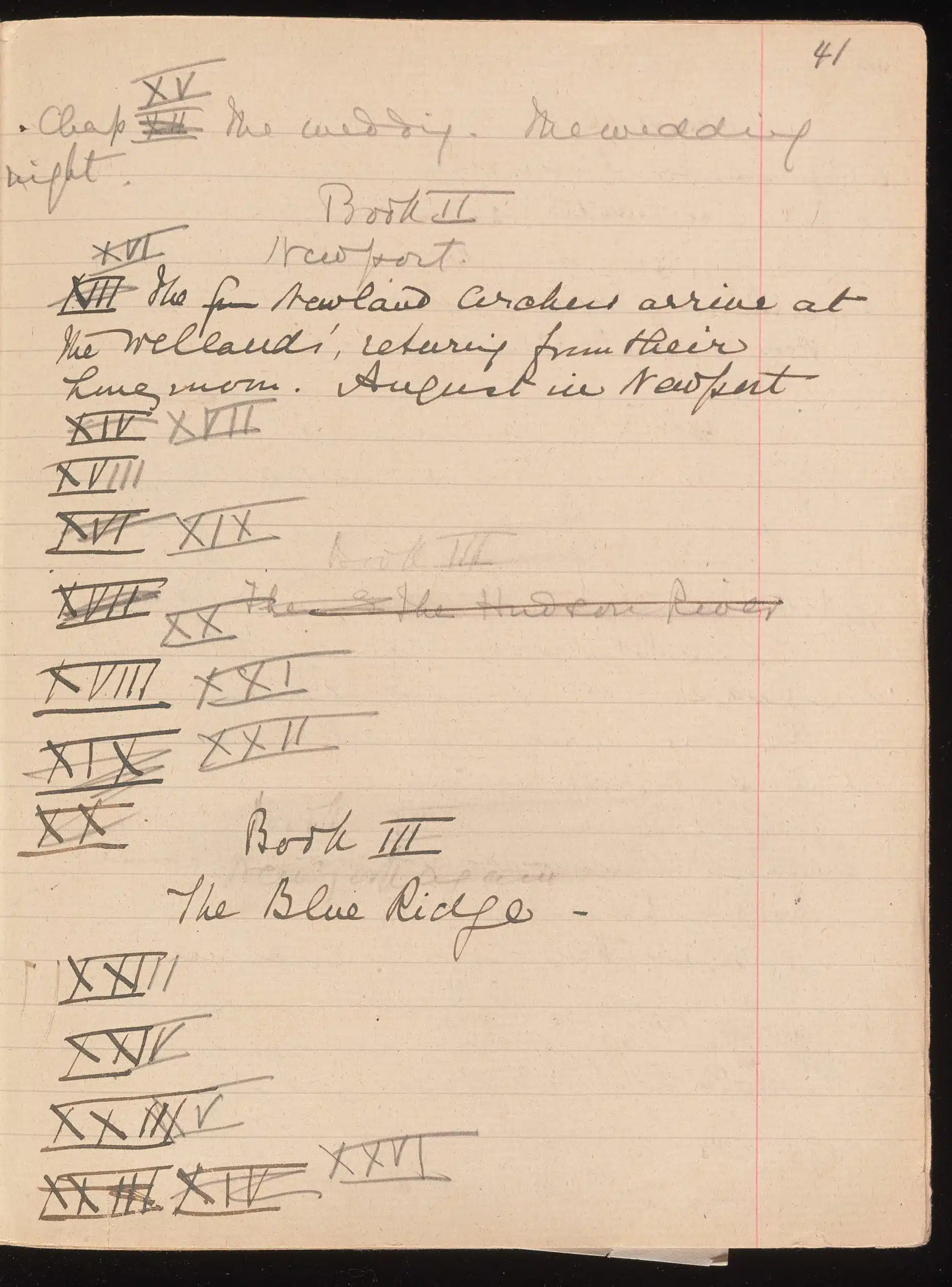 In her notes, Wharton outlined chapters for The Age of Innocence, writing mainly in pencil with crossed out changes rather than erasures, allowing us a glimpse into her thought processes.