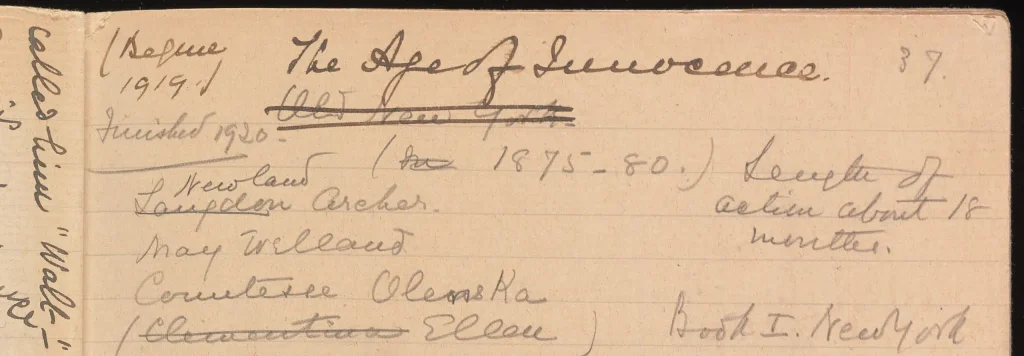 The Age of Innocence, published in October 1920, is one of Edith Wharton’s most enduring works. She wrote it at high speed, completing the 365-page novel in less than seven months. Forced by financial reasons into this compressed time schedule, her notes, manuscripts, and letters reveal both craftsmanship and pragmatism.