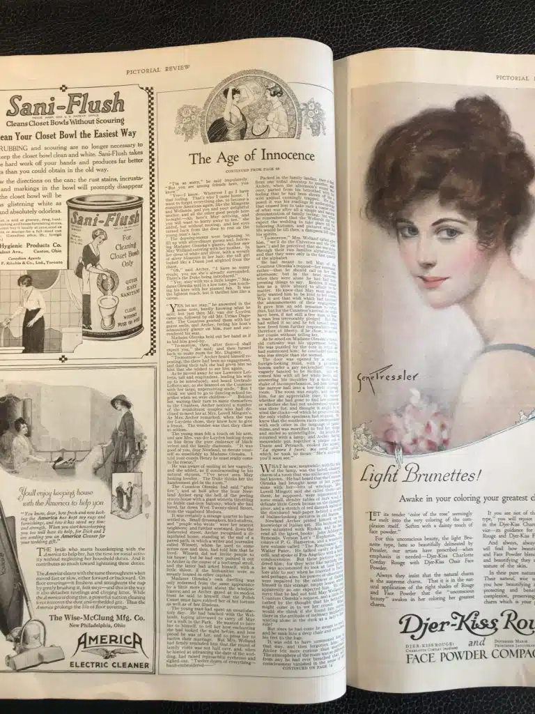 The initial installment of The Age of Innocence debuted in the July 1920 issue of the Pictorial Review. This was Wharton’s first appearance in the ad-stuffed, mass market magazine, which paid some of the highest prices in publishing.